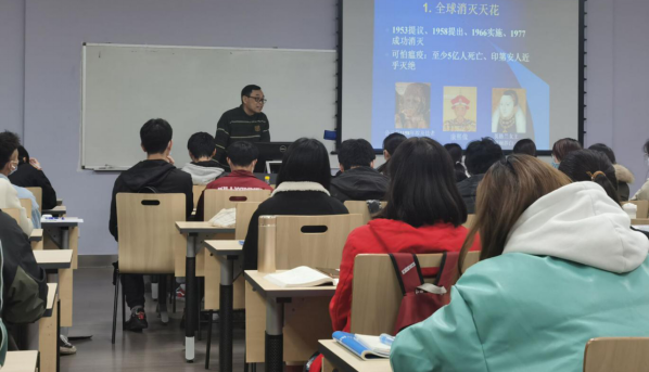 黄忠兵教授首先通过天花疾病危害、天花疫苗,引出中医的历史,通过文献记载,可以若同学们清楚地了解到在很早以前古人们就已经对天花进行预防和治疗。“以毒攻毒”是中国古代医学朴素的免疫思想,这种思想与现今的疫苗接种有着很大的相似之处。黄教授还为大家讲述了预防疾病的中医基本思想,可以让大家清楚地了解到中医在中国历史乃至人类历史的长河中具有重大的意义。