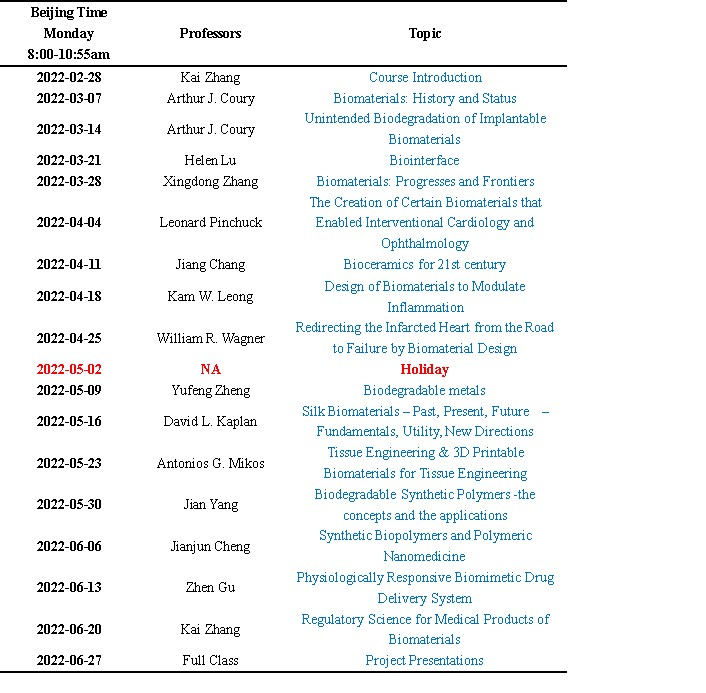 附《国际生物材料名师精品课程》课程安排: