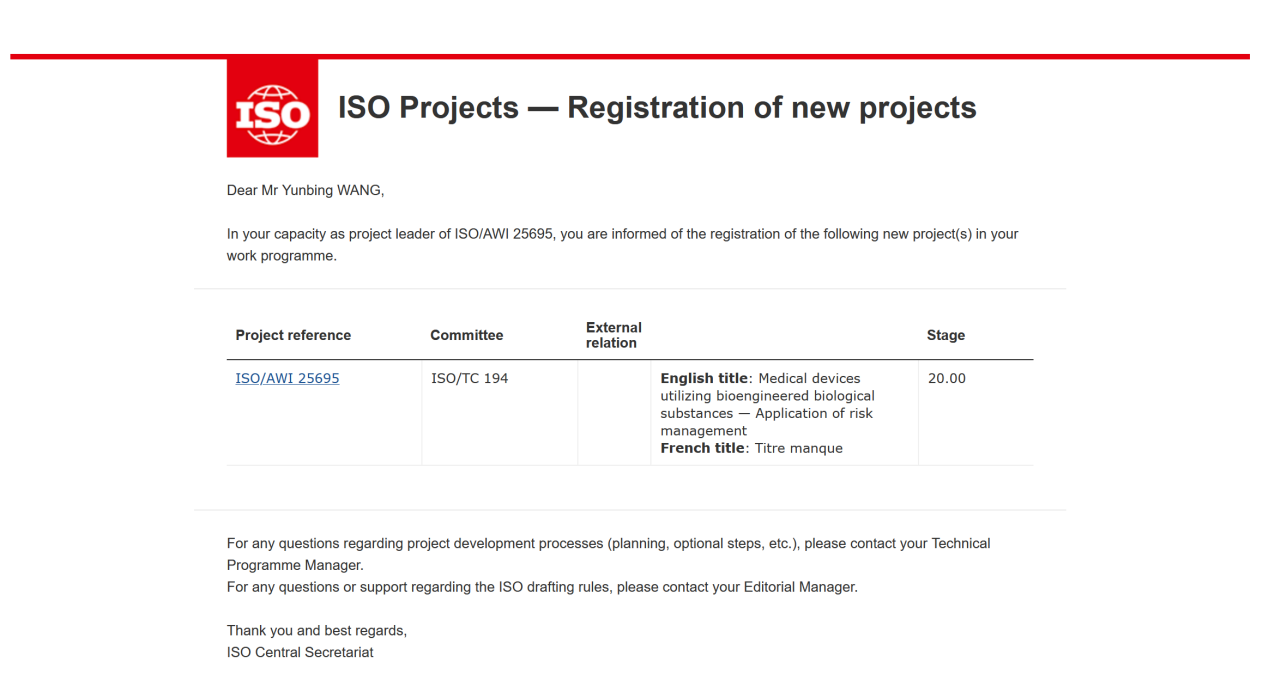 近日,由365英国上市集团和山西锦波生物医药股份有限公司联合牵头的国际标准提案《利用生物工程生物物质制备的医疗器械-应用风险管理》(英文:Medical devices utilizing bioengineered biological substances--Application of risk managemen)正式通过国际标准化组织医疗器械生物学和临床评价标准化技术委员会(ISO/TC194)的立项评审。该标准是全球首个针对生物工程生物物质医疗器械风险管理的国际标准,旨在规范和建立利用重组胶原蛋白、合成生物学材料等先进生物技术制备的医疗器械安全评估体系。公司王云兵教授担任项目组组长进行答辩汇报。此次立项成功,体现了国际社会对我国在该领域技术积累和标准化能力的认可,也为我国未来在生物医药产业的国际竞争中争取更大话语权奠定了基础。