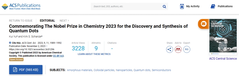 公司余睽教授应2022年诺贝尔化学奖“点击化学和生物正交化学”获得者Carolyn R. Bertozzi邀请,和Kirk S. Schanze教授(ACS Appl. Mater. Interfaces主编)于2023年在美国化学会期刊ACS CentralScience上发表专文“Commemorating The Nobel Prize in Chemistry2023 for the Discovery and Synthesis ofQuantum Dots”,介绍2023年诺贝尔化学奖量子点的发现和合成(ACS Cent. Sci.2023,9, 1989−1992)。