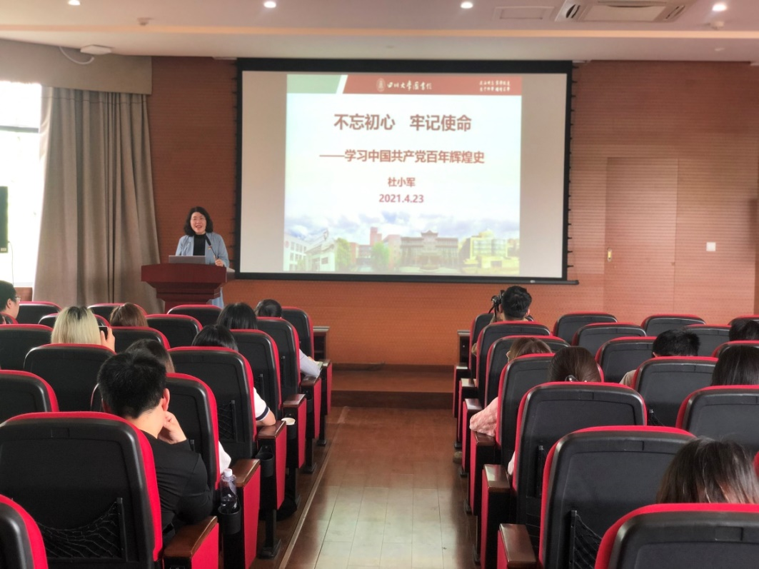 活动的第二阶段工学图书馆党支部支部书记图书馆副馆长杜小军主讲了专题党课“不忘初心 牢记使命——学习中国共产党百年辉煌史”。党课从“为什么学习中国共产党党史”的问题出发,深入浅出地理清了党史的基本脉络,讲述了四史逻辑关系,重点强调了中国共产党的基本经验与规律。她激励在座的青年学子,从党史学习中汲取成长智慧与力量,坚定理想信念,明确使命担当,投身全面建设社会主义现代化国家新征程。