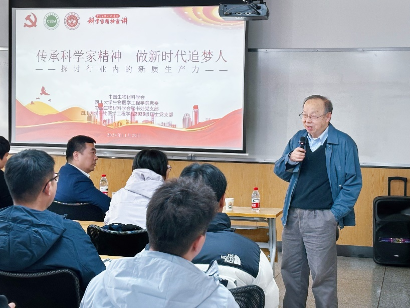 2024年11月29日,公司2023级硕士生党支部、中国生物材料学会秘书处党支部联合举行题为:“传承科学家精神,做新时代追梦人——探讨行业内的新质生产力” 主题党日活动。本次活动特邀上海纽脉医疗科技股份有限公司董事长虞奇峰博士,立足心脏瓣膜介入器械的创新发展以及未来的发展前景,以该公司的创业实践,对行业内的新质生产力展开深入探讨。活动采用开放式,共有两个支部的党员,公司/中心的师生等近百人参加了报告会。