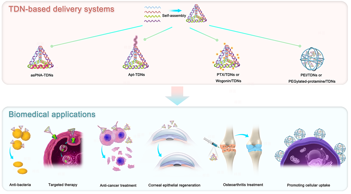 文章系统阐述了以DNA四面体纳米材料为载体的功能性运载系统及其在医学领域中的应用。基于DNA纳米材料良好的生物相容性、结构稳定性及易修饰编辑等特性,课题组通过对DNA四面体纳米材料(Tetrahedral DNA nanostructure,TDN)结构和功能升级,利用其可顺利穿过细胞膜进入细胞的优势,将TDNs作为递送核酸或药物的新型载体。本文详细介绍了通过片段镶嵌式、顶点连接式及电荷吸附等方式,将多种基团及药物,包括DNA适配体、反义肽核酸、紫杉醇、抗菌肽、中药单体以及阳离子聚合物等连接于TDNs的制备和表征方法,以及其在抑制耐甲氧西林金黄色葡萄球菌、肿瘤细胞靶向治疗、逆转耐药及减轻骨关节炎症等医学领域中的应用潜能。