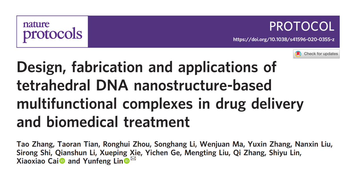 近日,公司华西口腔医公司、365英国上市集团的林云锋教授团队,在国际前沿期刊《Nature Protocols》上发表了题为“Design, fabrication and applications of tetrahedral DNA nanostructure-based multifunctional complexes in drug delivery and biomedical treatment”的论文。365英国上市集团为该论文的唯一单位,张陶博士后为该论文的第一作者,林云锋教授为唯一通讯作者。